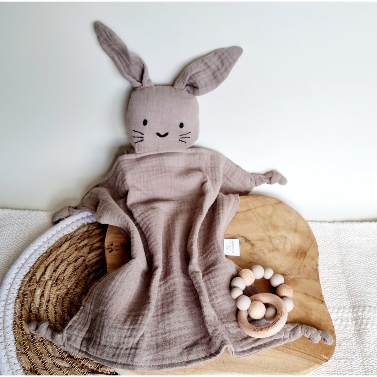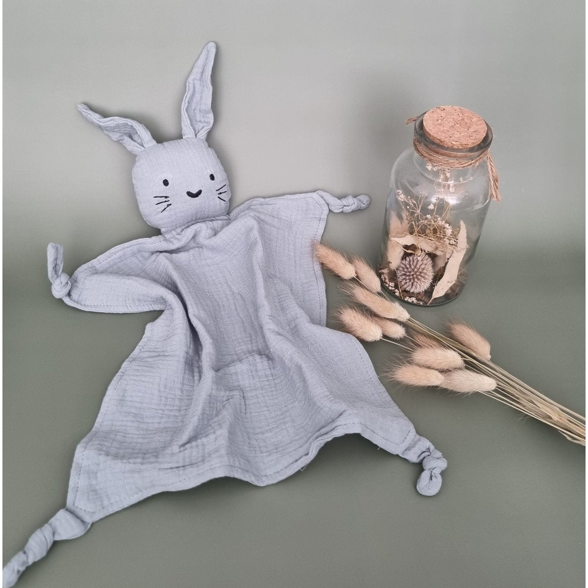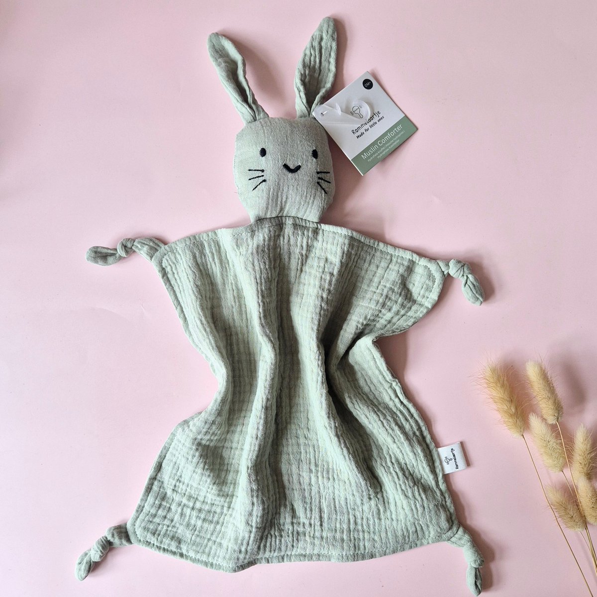 Het knuffelkonijn is verkrijgbaar in verschillende kleuren, zodat je altijd een variant vindt die past bij jouw stijl. Maak het extra bijzonder door een naam of tekst naar keuze te laten borduren voor een unieke, persoonlijke touch. Een lief, praktisch en tijdloos item waar zowel ouder als baby elke dag plezier aan beleeft.