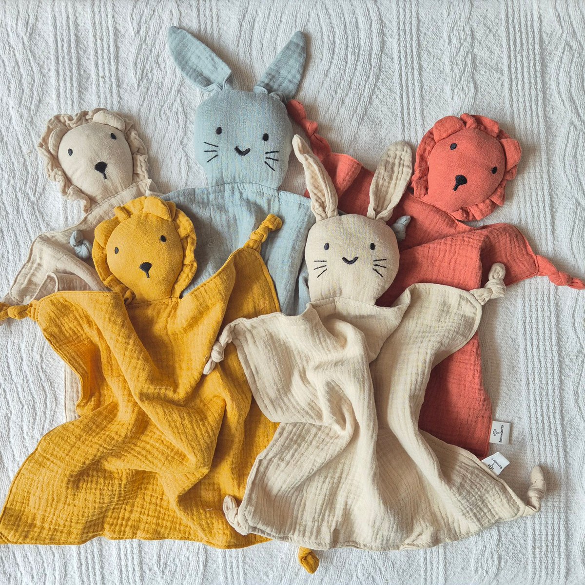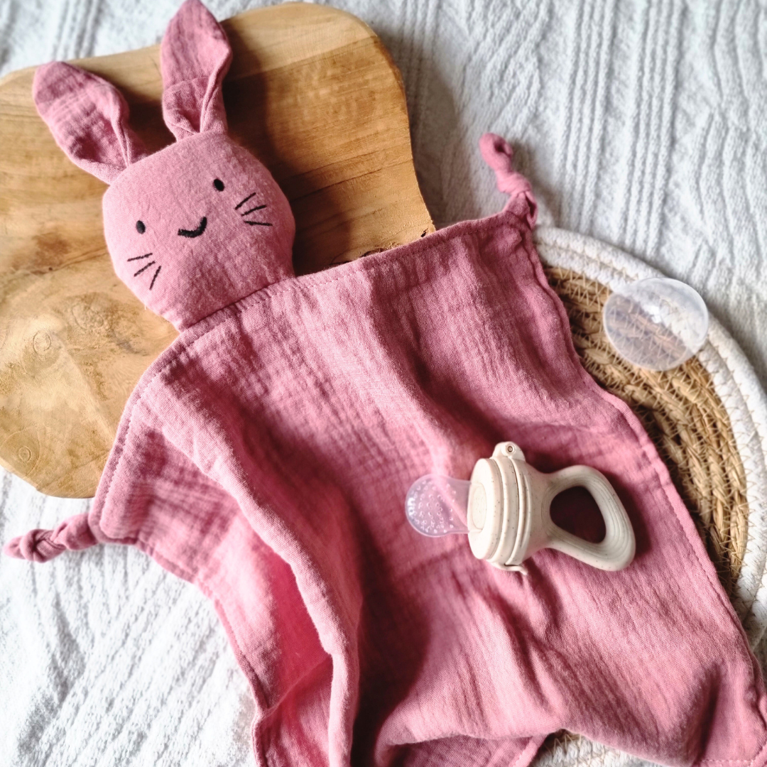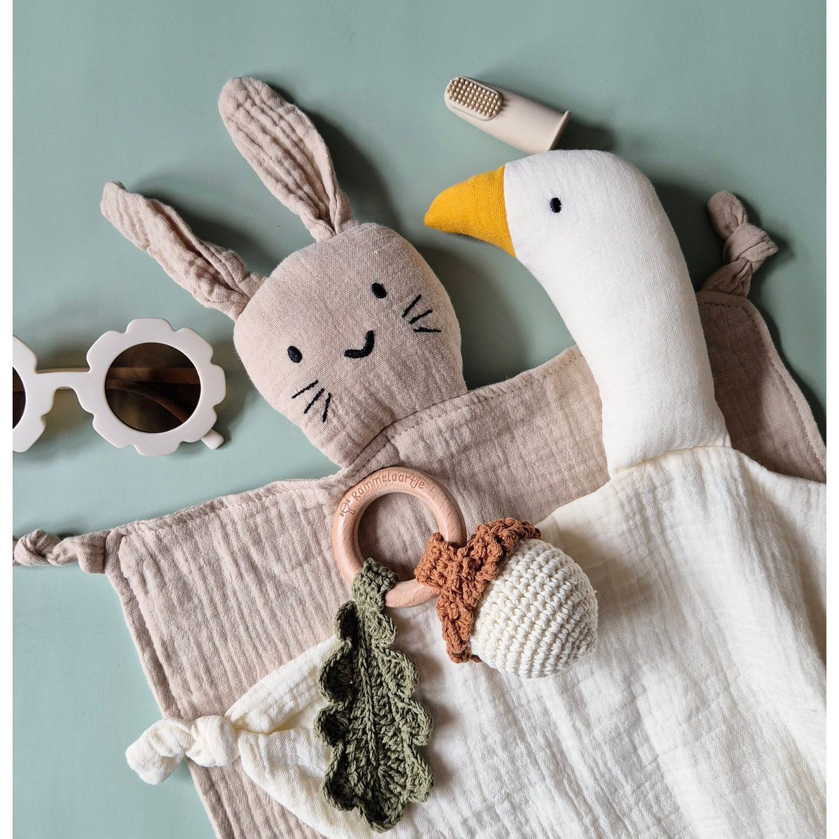 Het knuffelkonijn is verkrijgbaar in verschillende kleuren, zodat je altijd een variant vindt die past bij jouw stijl. Maak het extra bijzonder door een naam of tekst naar keuze te laten borduren voor een unieke, persoonlijke touch. Een lief, praktisch en tijdloos item waar zowel ouder als baby elke dag plezier aan beleeft.