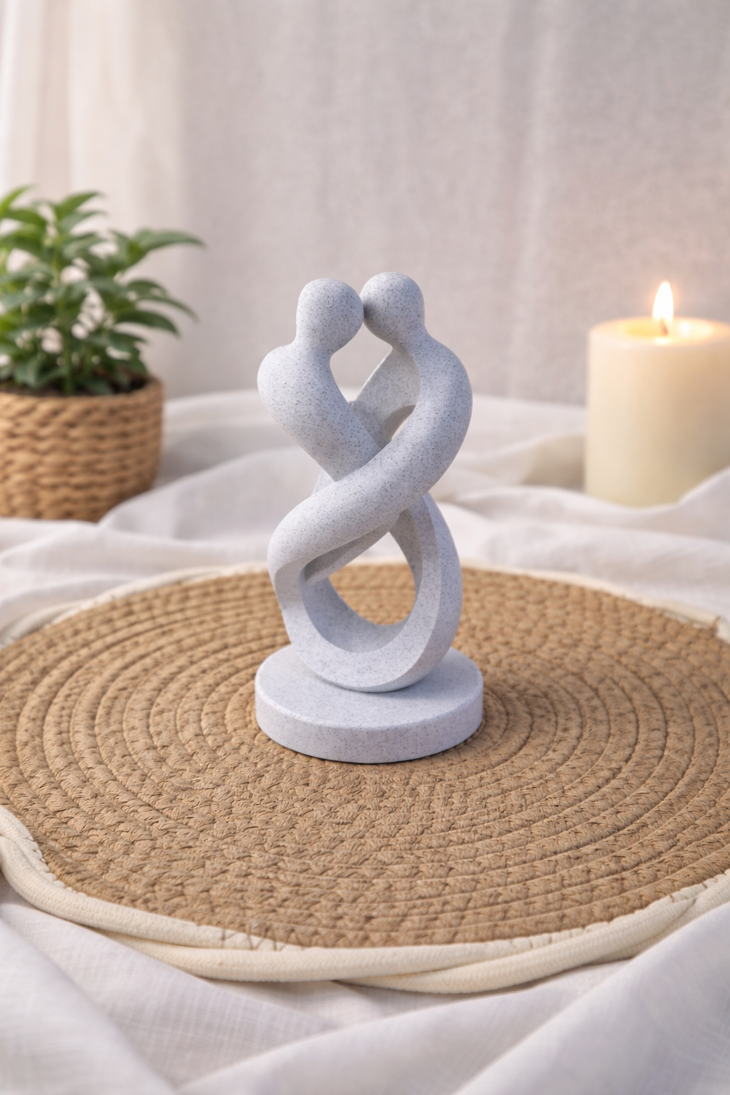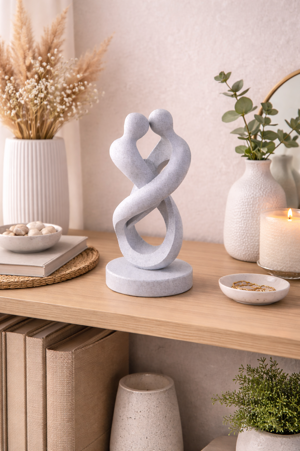 Dit elegante standbeeld United in Love verbeeldt twee zielen die onlosmakelijk met elkaar verbonden zijn. De vloeiende vormen en het moderne, minimalistische design symboliseren oneindige liefde, harmonie en samenzijn. Een stijlvol decoratiestuk dat warmte en emotie brengt in elk interieur.
