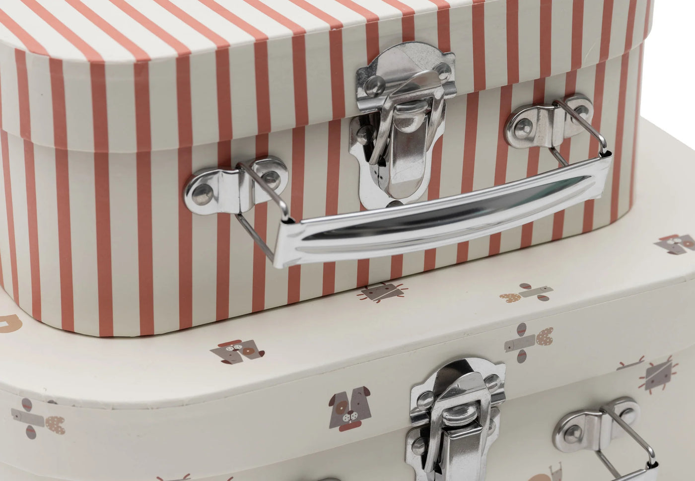 Deze speelkoffertjes uit de Animal Friends-collectie zijn ideaal voor je kleintje! Het grotere koffertje heeft een vrolijke all-over print, terwijl het kleinere koffertje een warme soft-terra kleur krijgt met een schattig hondje op de voorkant. Beide koffertjes zijn aan de binnenkant afgewerkt met een milky-coffee ruitje en de tekst “belongs to”, zodat ze altijd herkenbaar zijn.